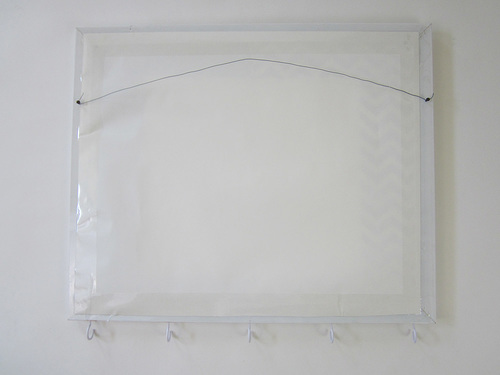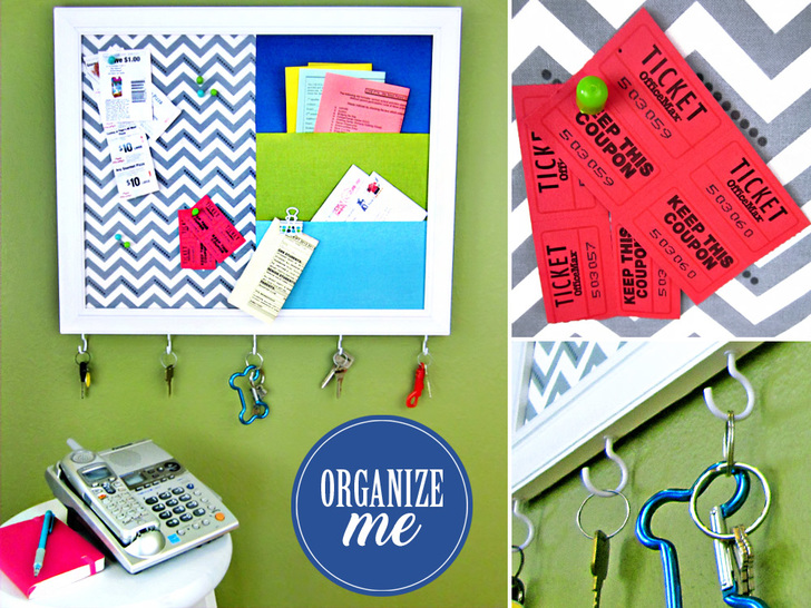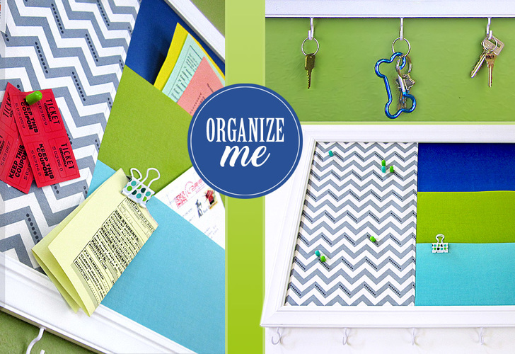 We found our simple white frame at a local craft store, however, you could also look at second hand shops or garage sales for old framed art; remove the art and replace it with your cool pinboard. A wooden frame is best because then you can screw in cup hooks along the bottom to corral your keys.