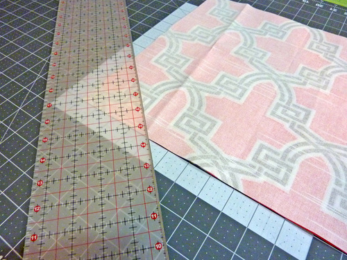 2. Place the panels on your cutting mat in the proper orientation (14″ wide). Trim the bottom two corners at a 45˚ angle. You want to orient the cuts with your motif, centering the design and insuring the two cuts are exact mirror images of one another. Our cuts were approximately 4″ along the diagonal.