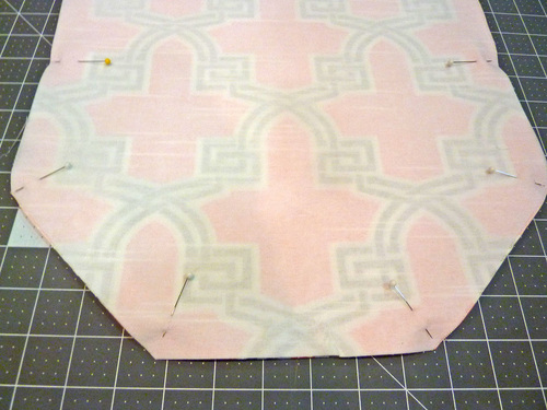 6. Place the two flap panels right sides together again, aligning all the raw edges. Pin in place along both sides and across the angled bottom.