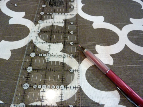 8. Find the exact center of the pocket and draw a vertical line through the pocket at this point. Use your see-through ruler and a fabric pen or pencil. You are working on the right side of the fabric so be sure the writing tool will easily wipe or wash away or vanish with exposure to the air or the heat of an iron.