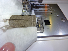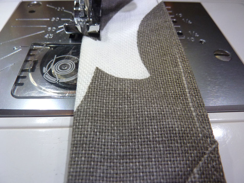 11. Attach the two strips as you would two lengths of binding. The two lengths should be at right angles to one another. Pin in place, then stitch across from top to bottom on the diagonal.