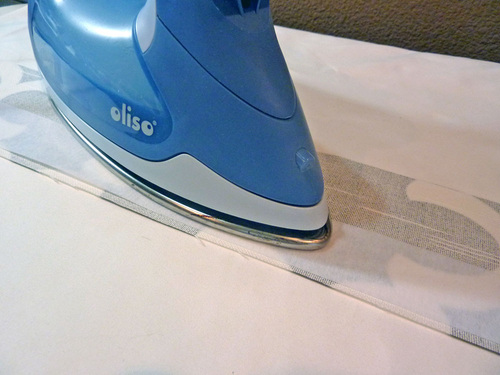 3. Center the interfacing on the wrong side of each fabric panel. It should be positioned on the top half of the fabric panel ½” down from the top raw edge and ½” in from each side. Following manufacturer’s instructions, fuse in place. It helps to first fold the panel in half and press to set a center crease line. You can then use this crease to align the edge of the interfacing.