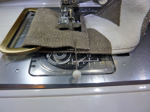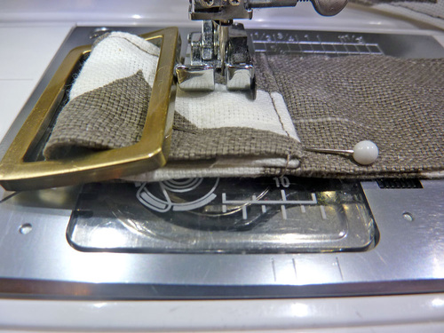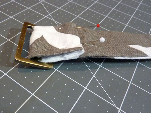 17. Turn under the raw end of the strap ½”. Loop this folded end through the center of the slider and pin in place as shown below.