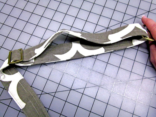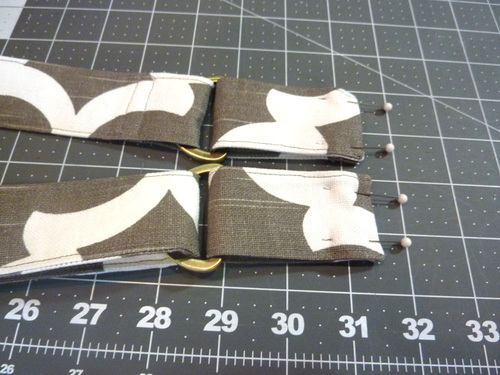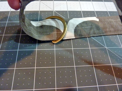 19. With the strap laying wrong side up (so you can see that folded-under end), find one of the D-rings. Thread the finished end, bottom up, through the curved side of the D-ring (from the bottom up).