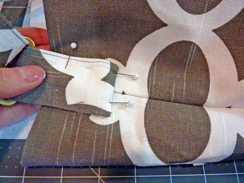 23. Find the exterior bag. Place a tab at each side seam. The tab should be centered over the seam and the finished end of the tab should sit 2″ down from the top raw edge of the bag. Pin the tab in place.
