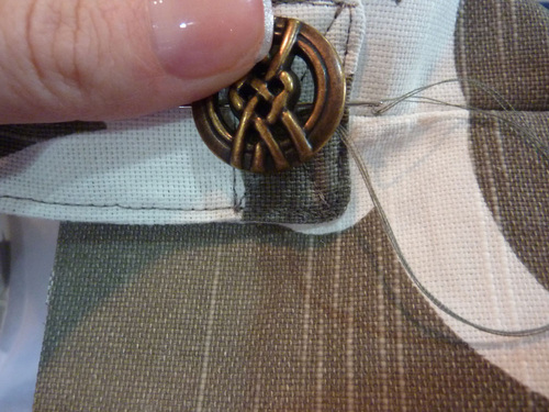 25. Thread a hand sewing needle and stitch a decorative button at the center of the X-box through all the layers.