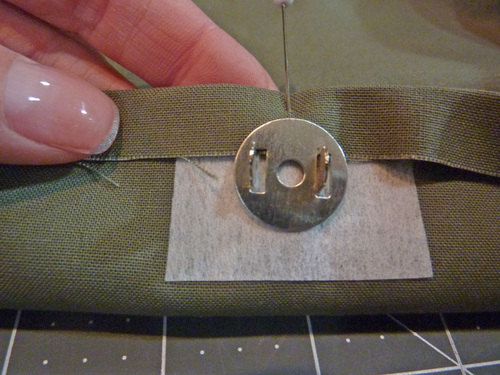 24. Find the magnetic purse snap. Following manufacturer’s instructions. or our own handy magnetic snap tutorial, insert one half of the snap at each center point of the lining. The snap inserts from the front through to the back.