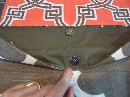 6. Bring the lining up into place over the flap and pin the lining to the exterior all the way around the top of the bag. The folded edges of the two layers should be perfectly flush. If they don’t line up, simply roll one or both folds until they match up.