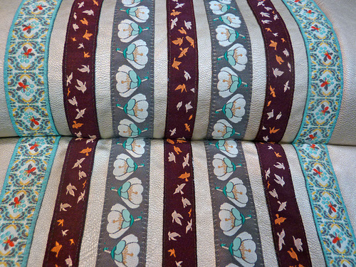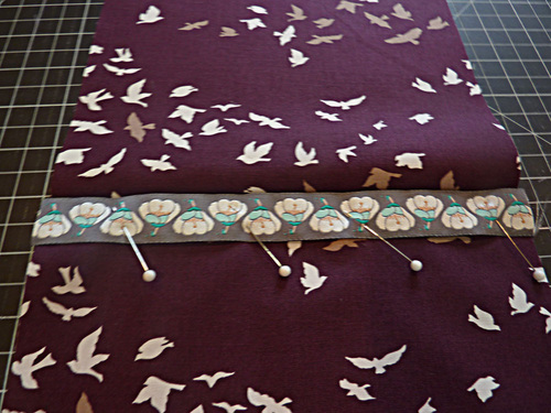 - It is best to pin and stitch the ribbons one at a time rather than pinning all and then stitching all. By working with one at a time, you are better able to keep each ribbon flat because the fabric to one side is flat and the fabric/ribbons to the other side are sewn in place and so also flat.