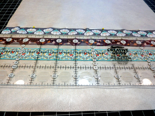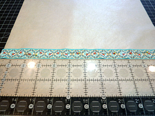 - Starting with the bottom and working your way up, place the first ribbon (⅞” Aqua & Gold Bee Sweet Brocade). The bottom edge of the ribbon should sit 2½” up from the bottom raw edge of the fabric. Take the time to insure the ribbon is perfectly straight and parallel with the bottom of the fabric. Pin or fuse in place.