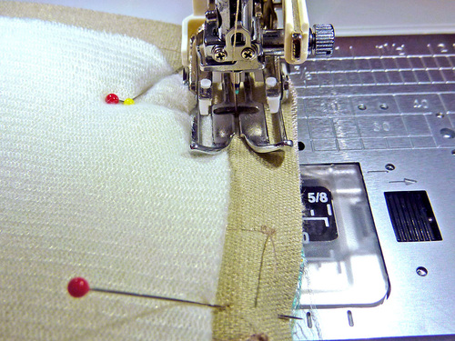 - Pin or clip the panels in place, and using a ½” seam allowance, stitch along both sides and across the bottom. Again, we are using a Walking foot. Your seam line should run right along, but not on, the foam interfacing.
