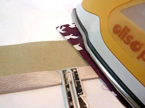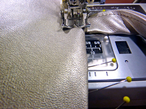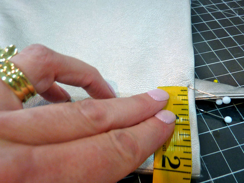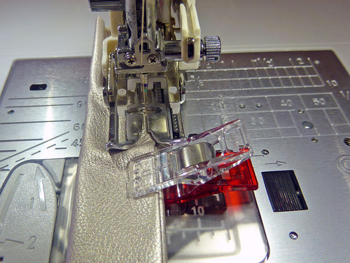 NOTE: This step is MUCH easier with a Walking foot. If you don’t have this foot, you may need a Teflon® type foot or to insert a sheet of parchment or wax paper under the foot to keep the presser foot moving smoothly across the faux leather.