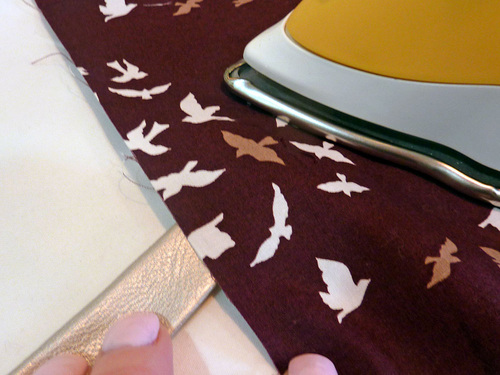 - Press back each 25″ raw edge ½”. Use a pressing cloth against the faux leather. You can see in our photo that we simply used a scrap of lining fabric for our pressing cloth.