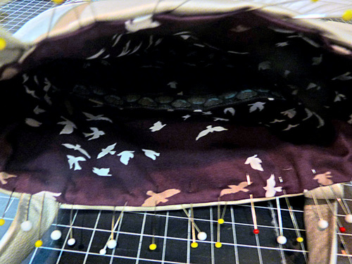 - Find the lining. It should be wrong side out. Slip the lining inside the exterior bag so the two layers are wrong sides together. Align the bottom and side seams. The top folded edge of the lining should sit just barely below the top folded edge of the exterior bag. Adjust one or both folds as necessary. Pin or clip the lining to the exterior.