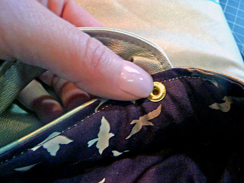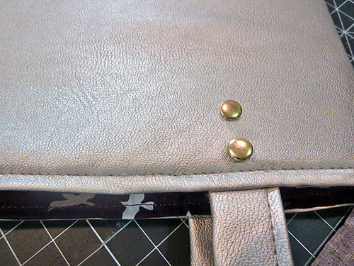 - Mark the placement for the pair of rivets that holds the end of each handle in place. The top rivet should sit just below the topstitching and the two rivet center points are ½” apart, which means there’s only about ⅛” of space between the finished rivets.
