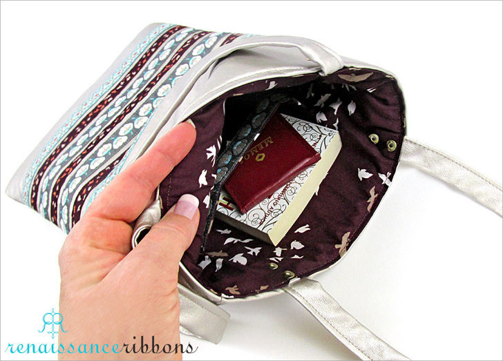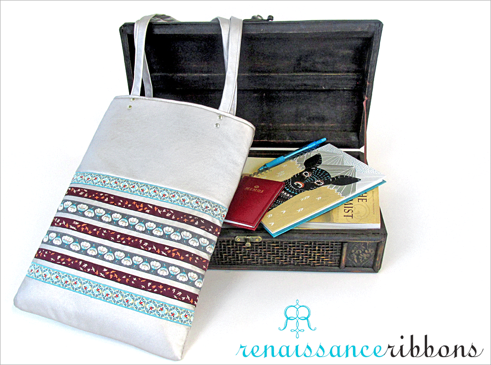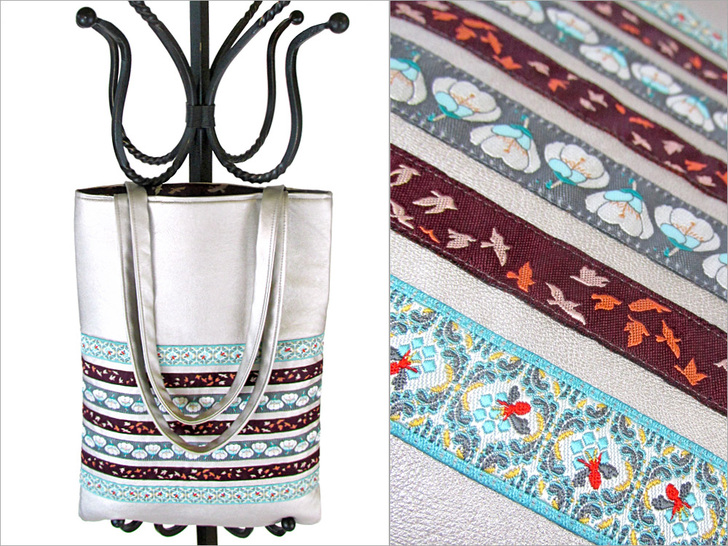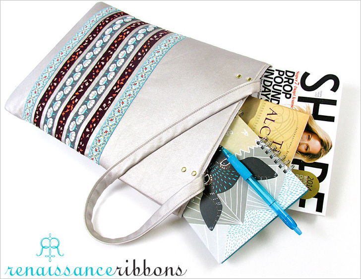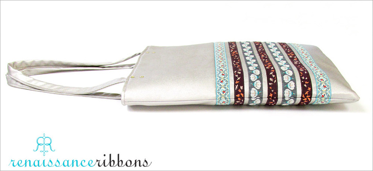 Tall, thin and elegant, this bag could be a runway model. Or maybe at least be carried by one of those long-legged beauties. Soft faux leather with a slight metallic sheen is the perfect background for the exquisitely woven, richly colored, simply beautiful jacquard ribbons from Renaissance Ribbons.