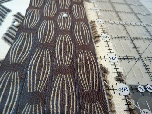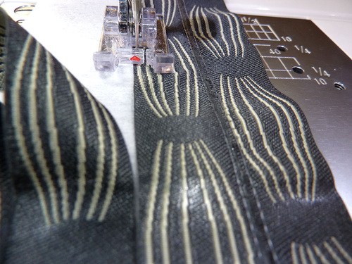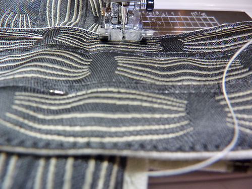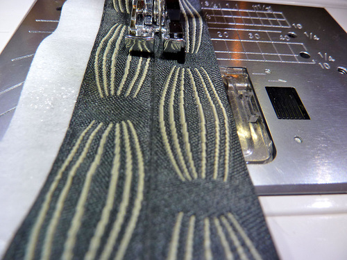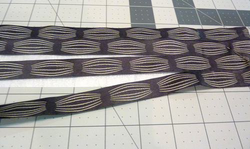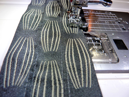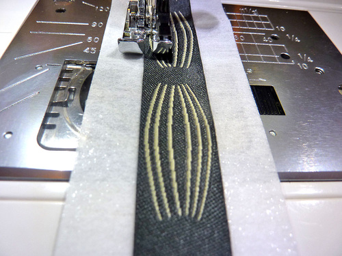 - Finally, butt the bottom ribbon into place. If you’ve been following along with our tile analogy, you know that the motifs on this ribbon should be aligned with the second ribbon. Edgestitch along just the top of this ribbon. As with your first ribbon, this last ribbon will have one free edge that extends beyond the interfacing. The photo below shows the stitching from the back, which is a bit easier to see than the black-on-black from the front (but that’s the idea, right?!).
