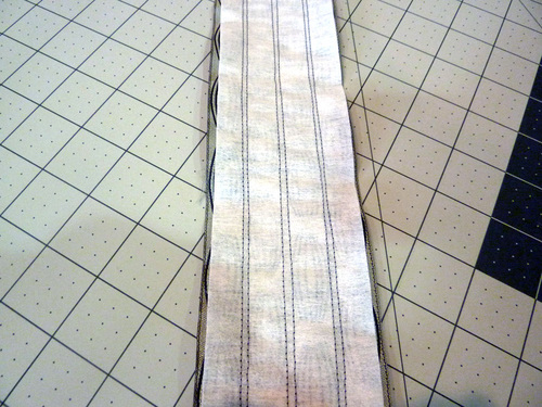 - Edgestitch the layers together along the two long sides, which also secures the two free edges of the ribbon.