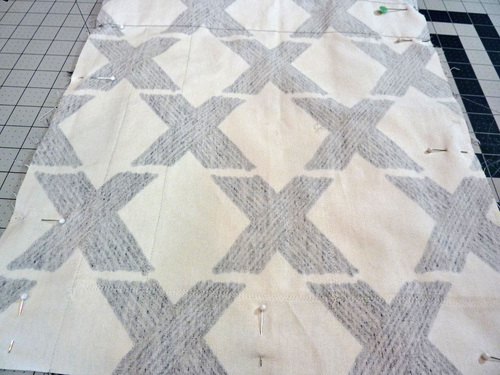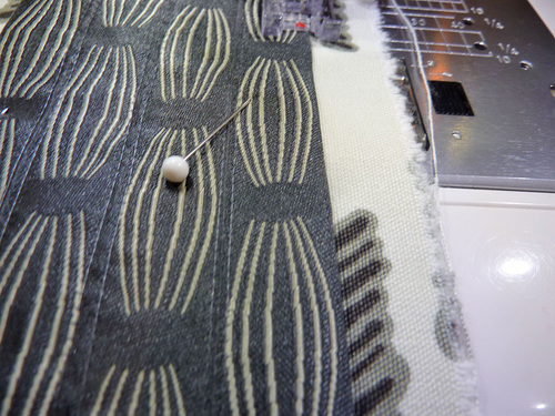 - Place the pocket on the panel. The left edge of the pocket should be flush with the left raw edge of the panel. The bottom hemmed edge of the pocket should be 2″ up from the bottom raw edge of the panel. Pin in place.