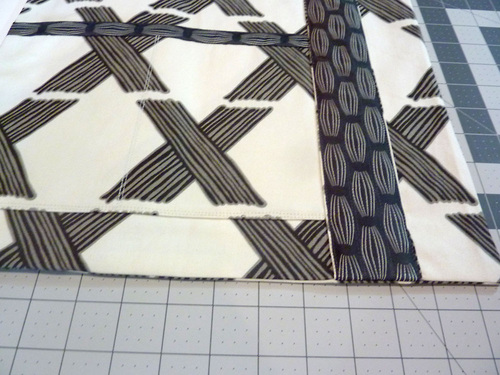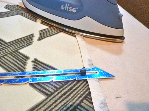 - Hem both sides and the bottom, using a faux miter in both corners to keep the pocket flat.