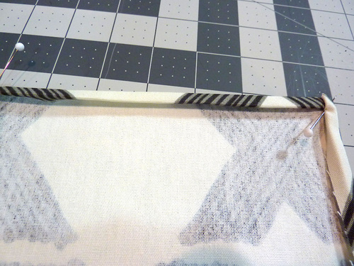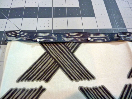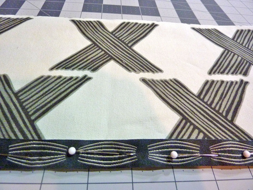 - Place an accent band horizontally across the top of each piece ⅝” down from the top raw edge. Pin in place.