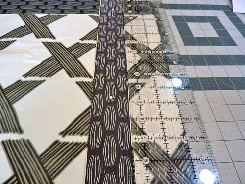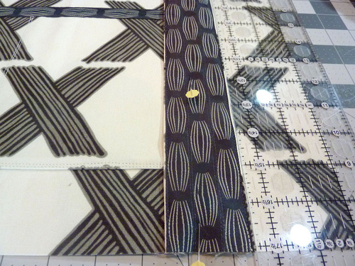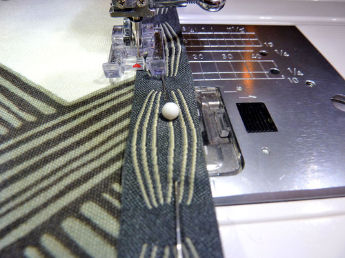 - Butt the third ribbon into place below the second ribbon. The motifs of this third ribbon should be aligned with the motifs on the first ribbon, which means they’ll be staggered with the second ribbon. That sounds confusing, but if you think about it like rows of tile, it will all make sense. Edgestitch along both sides of the third ribbon.