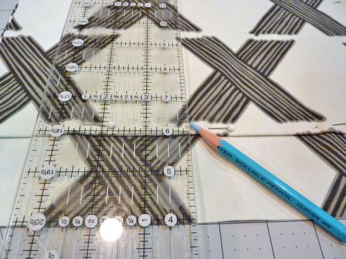 - Measure 5½” in from the left raw edges and draw a vertical line, using a fabric pen or pencil. This is the pocket dividing line.