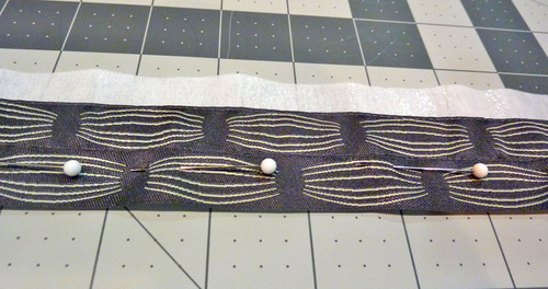 - Butt an outer ribbon into place and pin. As above, the ribbon will extend beyond the interfacing.