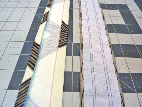 - We created “ribbon fabric” for the bag straps in the same manner as for the accent band, but with three lengths of ribbon rather than four.