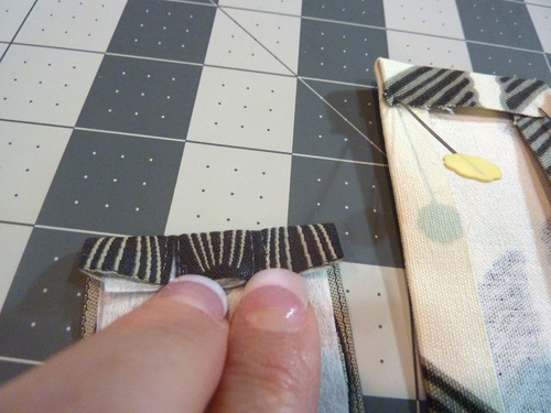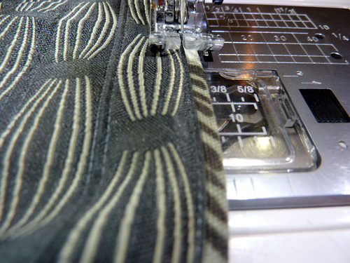 - First attach the ribbon to the folded-forward pocket top and edgestitch in place along both sides of the ribbon.
