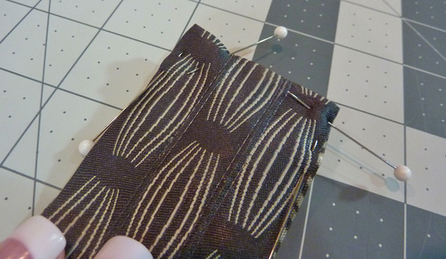 - Find the 12½” x 8″ exterior pocket panel. Place it right side up on your work surface. Fold down the top raw edge ½”. Yes, this means the wrong side of the fabric is showing. Pin in place.