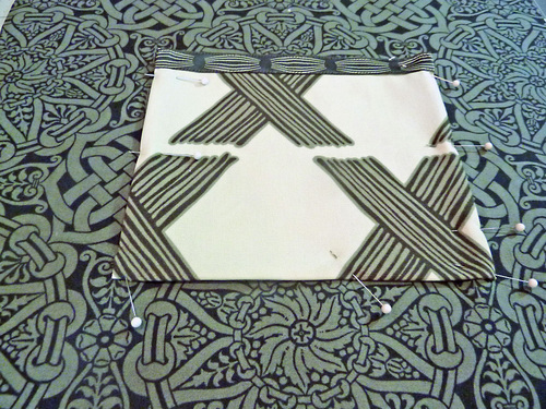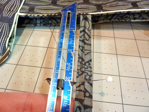 - Find the exterior bag. On the back panel, measure and mark the center along the top accent band. Pin the raw ends of both ties at this point. The ties should be side by side with no gap in between. The raw ends of the ties should extend 1″ below the raw edge of the panel. The knotted ends of the ties are extending out and away from the bag.