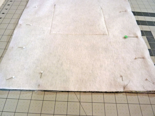 NOTE: If you are new to narrow hems and clean corners, we have a great step-by-step tutorial. - Find one of the fused lining panels. Place the finished pocket on the panel. It should be centered side to side and the top of the pocket should be 4½” down from the top raw edge of the lining panel. Pin in place along both sides and across the bottom.