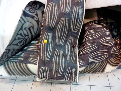 - Place the front and back exterior panels right sides together, aligning all the raw edges. Be especially careful to align the top accent bands along the sides. The two straps should be on opposite sides of one another. Pin in place along the sides and across the bottom.