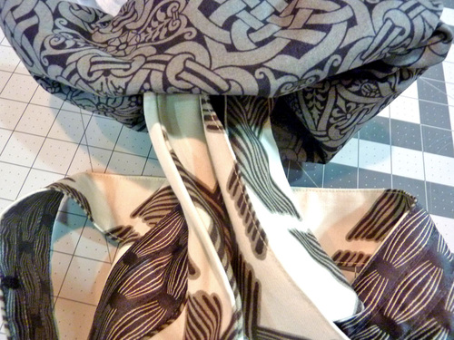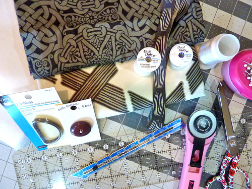 - Collect the lengths of ribbon, canvas and interfacing into two sets. One set for the 54″ front strap and one set for the 21″ back strap. As above, your ribbon motifs should be staggered.