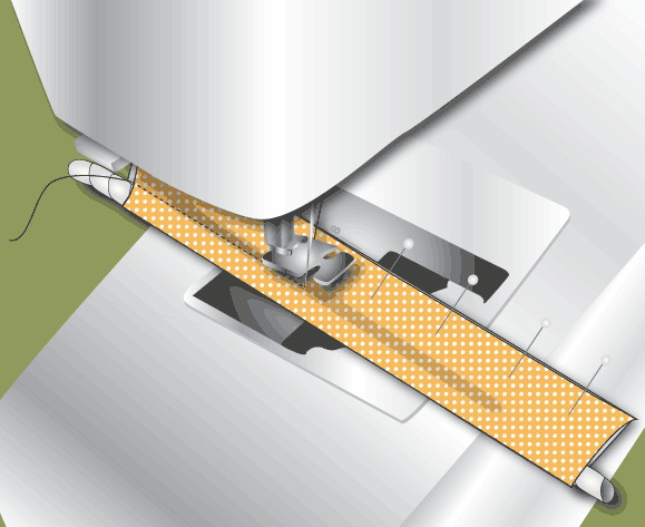 - Carefully move to your sewing machine and adjust the piping so the raw edges line up on your seam allowance marking and the wrapped cord pokes out to the left of your foot.