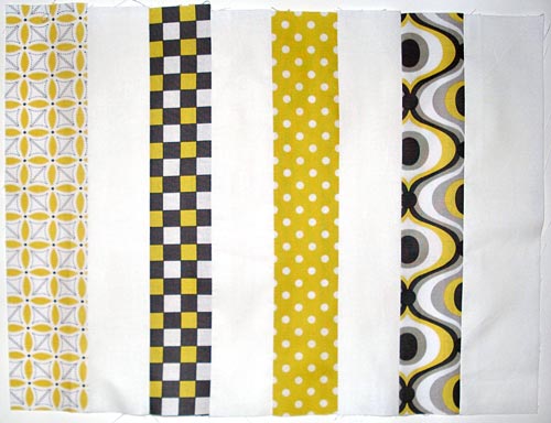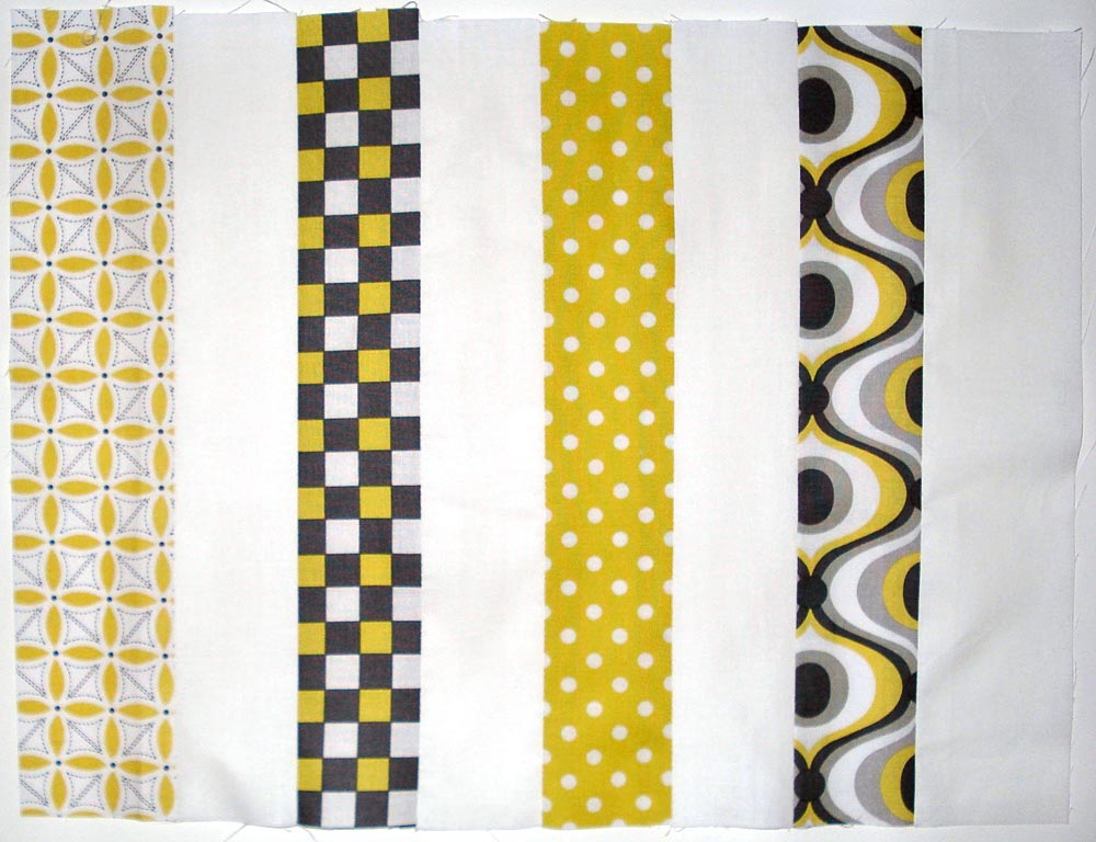 - Fabric for the PRINT stripes: Scraps or ⅛ yard EACH of EIGHT 44-45″ wide fabrics; we used the following seven designs from the Citron-Gray Color Story by Michael Miller Fabrics: Citron Stitch Petal, Citron Play Stripe, Citron Feeling Groovy, Citron Dumb Dot, Citron Good Gingham, Citron Dot ‘n’ Square, Charcoal Dumb Dot and Charcoal Disco Dot