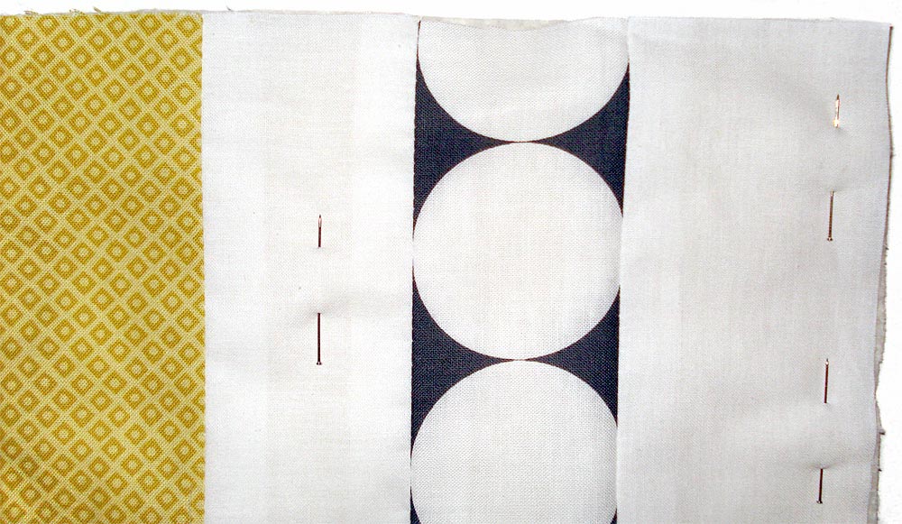 - Pin vertically from top to bottom inside the solid stripes, so the heads of the pins are facing towards the bottom edge. Run pins ⅛” from each seam and straight down the middle of each solid strip.