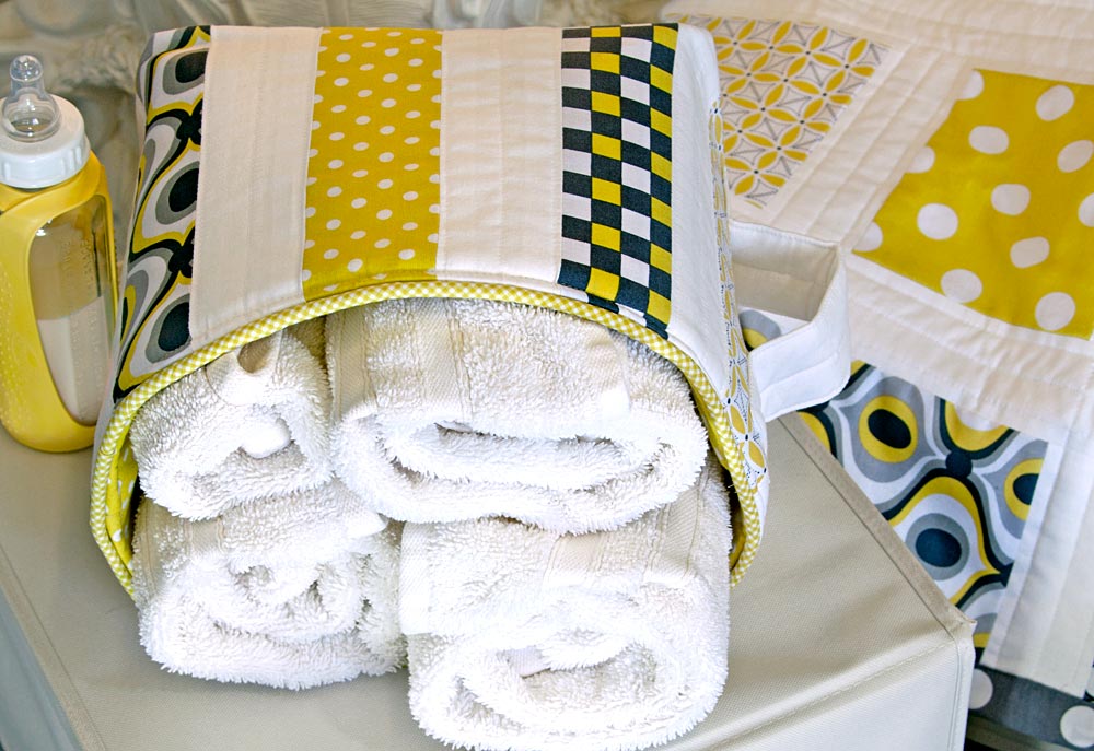No nursery series would be complete without some type of storage solution tutorial. I remember back when I had my first baby; it was a shock to realize how much stuff this one tiny person needed. A nursery is often filled to the brim with little things that have to be organized: creams, diapers, diaper wraps, wash cloths, toys, pacifiers, and more! Our Storage Shelf Basket tutorial is fast, easy and fun to make. So much so, you can make lots. Line the shelves with color-coordinated sets so there’s a place for everything (we cannot guarantee ‘everything in its place’!). With the side handle facing out, it’s easy to grab a basket and find exactly what you want. This terrifically-tidy project is just one of eight pieces in our new nursery series sponsored by our good friends at Michael Miller Fabrics. We created the entire Series using their Color Story concept. Our choice: the Citron-Gray Color Story with its cool colors and bold designs.