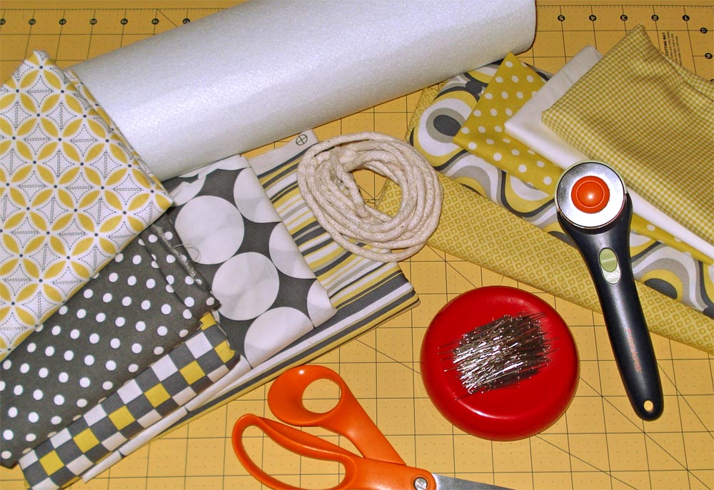 NOTE: This ½ yard of Citron Dumb Dot leaves enough to cut one of the print stripes noted above. - Fabric for the PIPING around the top: 1 yard of 44-45″ wide fabric; we used Citron Tiny Gingham from the Citron-Gray Color Story by Michael Miller Fabrics