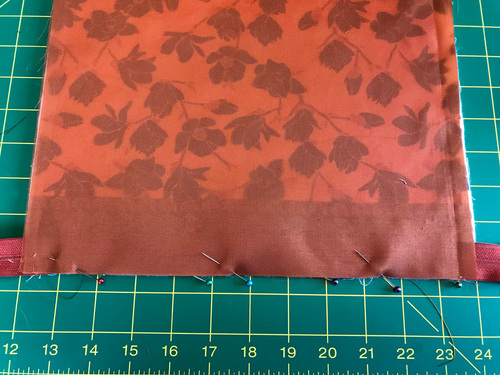 - To finish the edge of this last unsewn corner, turn both raw edges under ½”. Match up these folded edges and pin in place.