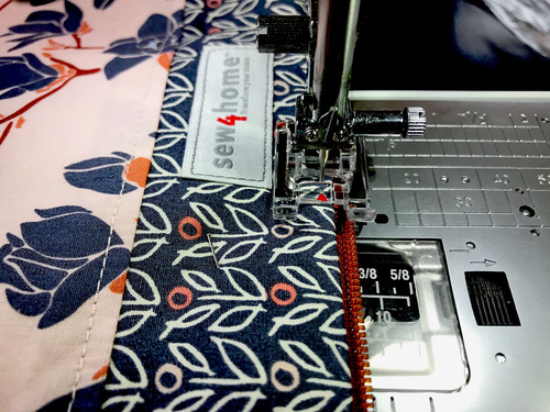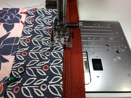 - Starting ½” in from the edge at your mark, stitch through all the layers. Your seam allowance will be approximately ¼” or narrower; you want to run your Zipper foot as close to the zipper teeth as possible while still keeping all your layers nice and flat.