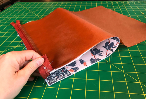 - Wrap the exterior around from the bottom and pin it in place along the free side of the zipper tape. The right side of the fabric should be against the right side of the zipper.