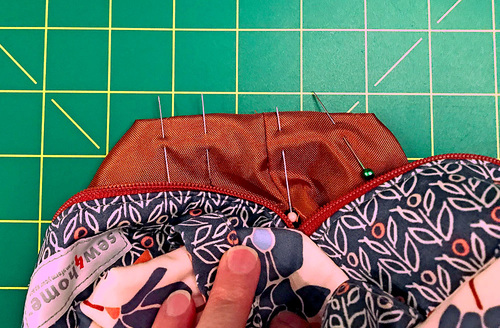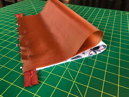 - Place the lining, right side down, on top of the exterior, sandwiching the zipper between the layers. As above, align the top raw edge of the lining with the edge of the zipper tape. Pin through all the layers, being careful to pin through just the top of the zipper tape. You need to be able to open and close the zipper, which you can’t do if you’ve pinned too low or through the teeth.