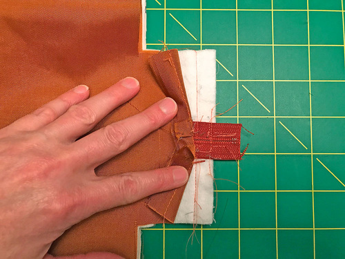 - At the top, where the tab is basted into place, You can clip away the raw edges of the tab so there won’t be too many bulky layers to easily move through the machine.