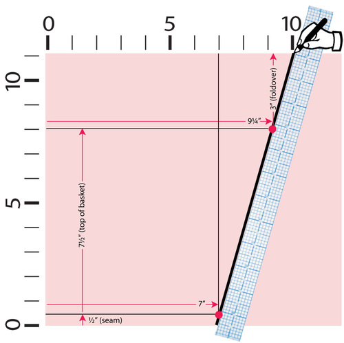 - The upper point is determined with a horizontal line at the height of the basket (7½” in our sample). Remember, to measure from the drawn ½” seam allowance line, not from the bottom raw edge of the folded panel. Draw a horizontal line at this measurement.