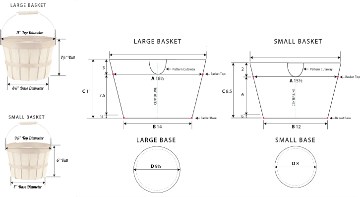 - To start, you need three measurements on your basket: top diameter, bottom diameter, and height. The illustration below shows you these measurements on our two sample baskets. In addition, there is a measurement you determine based on what looks best to you for your basket; this is the fold-over amount for the “cuff” of the liner. On our samples, we went with a 3” fold-over for the large basket and a 2” fold-over for the small basket.