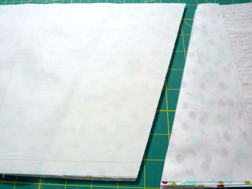 - Collect all the main panels: two fronts (print), two backs (solid), and two batting pieces.