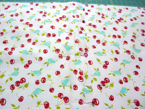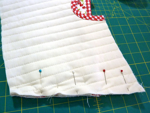 - If you’ve chosen straight line quilting, first fold each layered panel in half to find the center. Mark a vertical line through this center point. Pin along this center point.