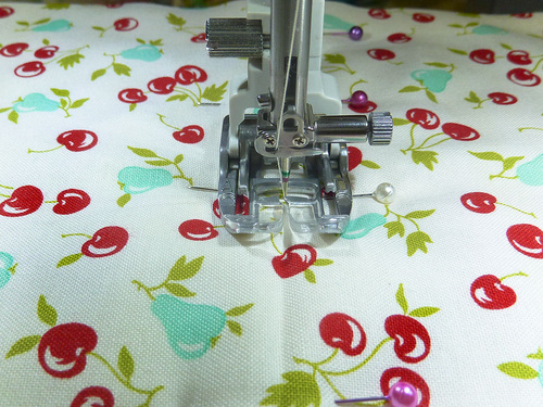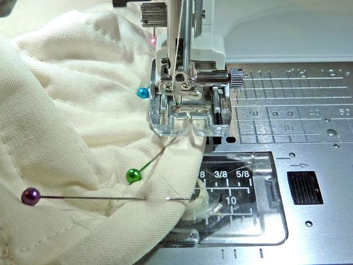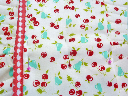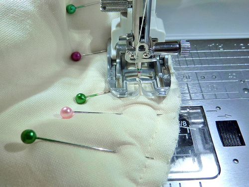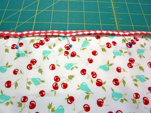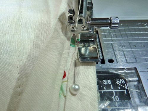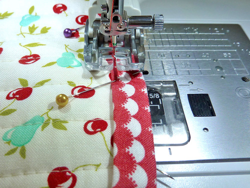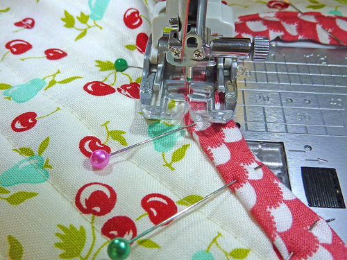 - Edgestitch the binding in place, removing the pins as best you can as you go along. Like all the binding above, go slowly and carefully to insure you are catching both the front and back of the binding in this one seam.